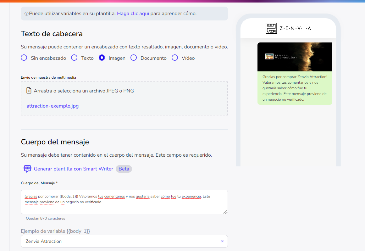 Cómo enviar un mensaje de WhatsApp con medios en Zenvia Attraction