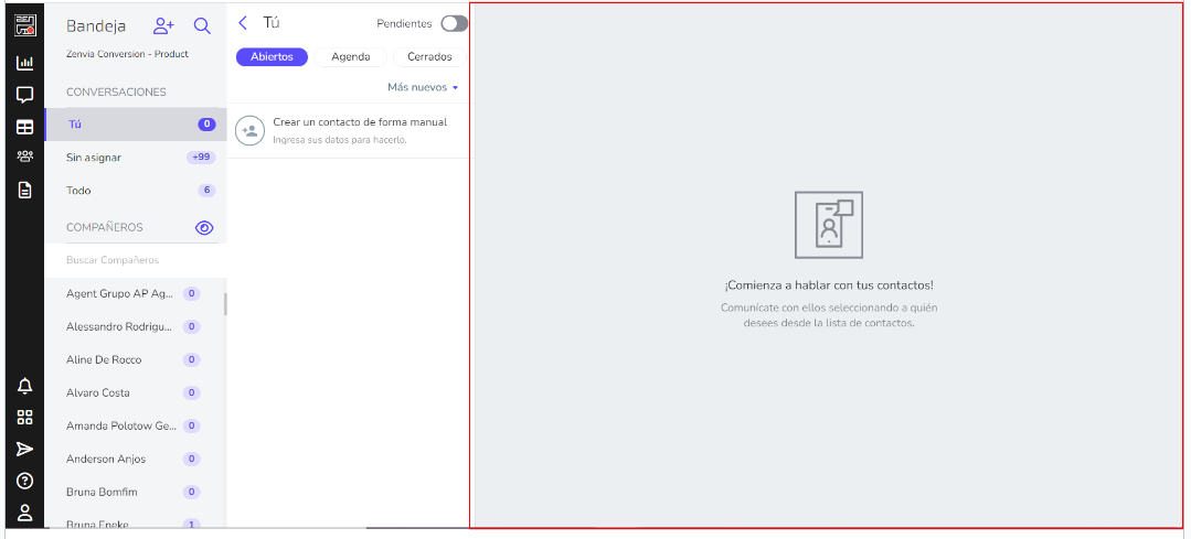 La Bandeja de entrada es donde se muestran todos los mensajes enviados y recibidos de sus contactos que esperan atención y se divide en secciones: Tú, No asignados, Todos y Compañeros.