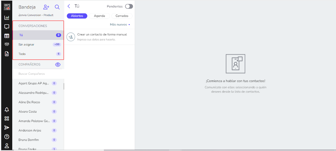 La Bandeja de entrada es donde se muestran todos los mensajes enviados y recibidos de sus contactos que esperan atención y se divide en secciones: Tú, No asignados, Todos y Compañeros.