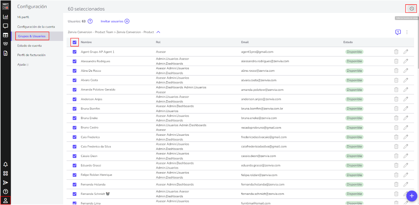 2 - Selecciona todos los usuarios para los que quieras modificar el horario de trabajo, o bien, elige el equipo completo y haz clic en el ícono del reloj, que se encuentra arriba a la derecha en tu pantalla: