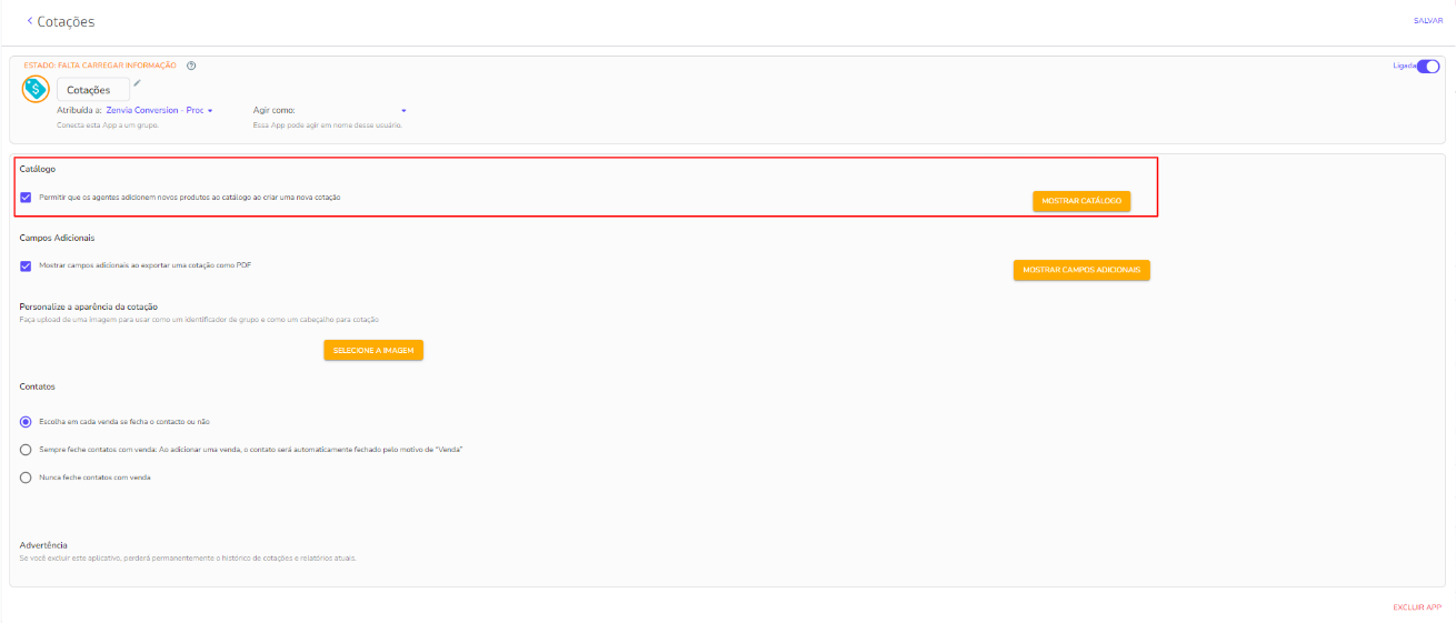 En Catálogo, elija si desea permitir que los Agentes agreguen nuevos productos a su catálogo al crear una nueva cotización, ya sea de forma manual o mediante un archivo CSV.