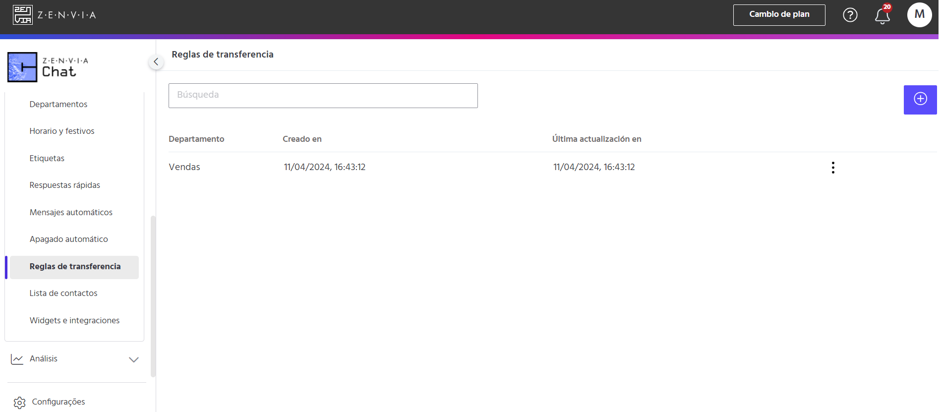 Para acceder a ella, vaya a Zenvia Chat - Perfil del Administrador > Servicio > Reglas de transferencia.