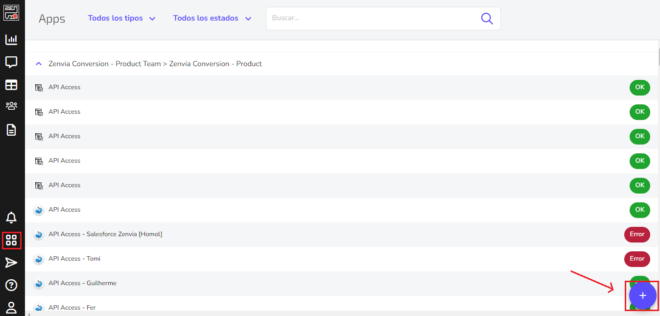 1 - Dirígite a Zenvia Conversion > Integraciones y haz clic en el botón + para agregar una app: