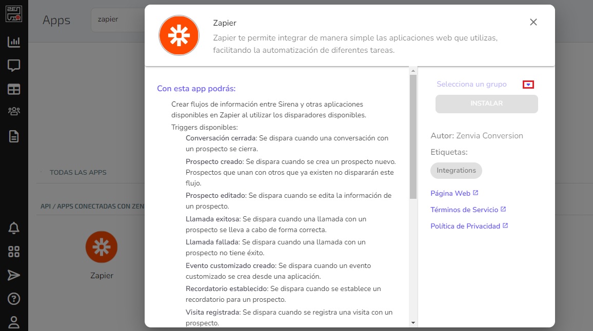 Elija un grupo al que deba asignarse Zapier, y luego de presionar Asignar haz clic en Instalar: