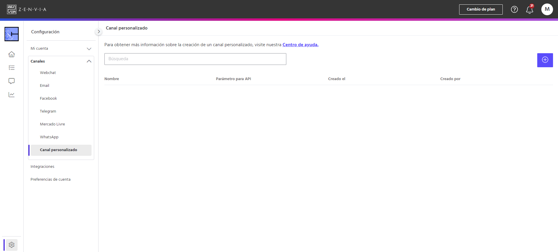 Para acceder a esta funcionalidad, vaya a Zenvia Chat - Perfil Administrador > Ajustes > Canales > Canal personalizado.