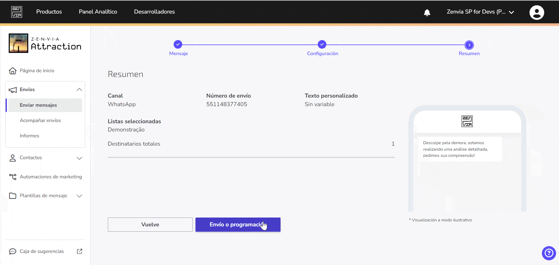 El envío inteligente encuentra el mejor momento para enviar sus mensajes. Esto se logra mediante el análisis del estado de los envíos realizados por su organización. Si su organización es nueva y no tiene suficiente historial, el mejor momento se determina en función de otras organizaciones que utilizan la plataforma Zenvia.