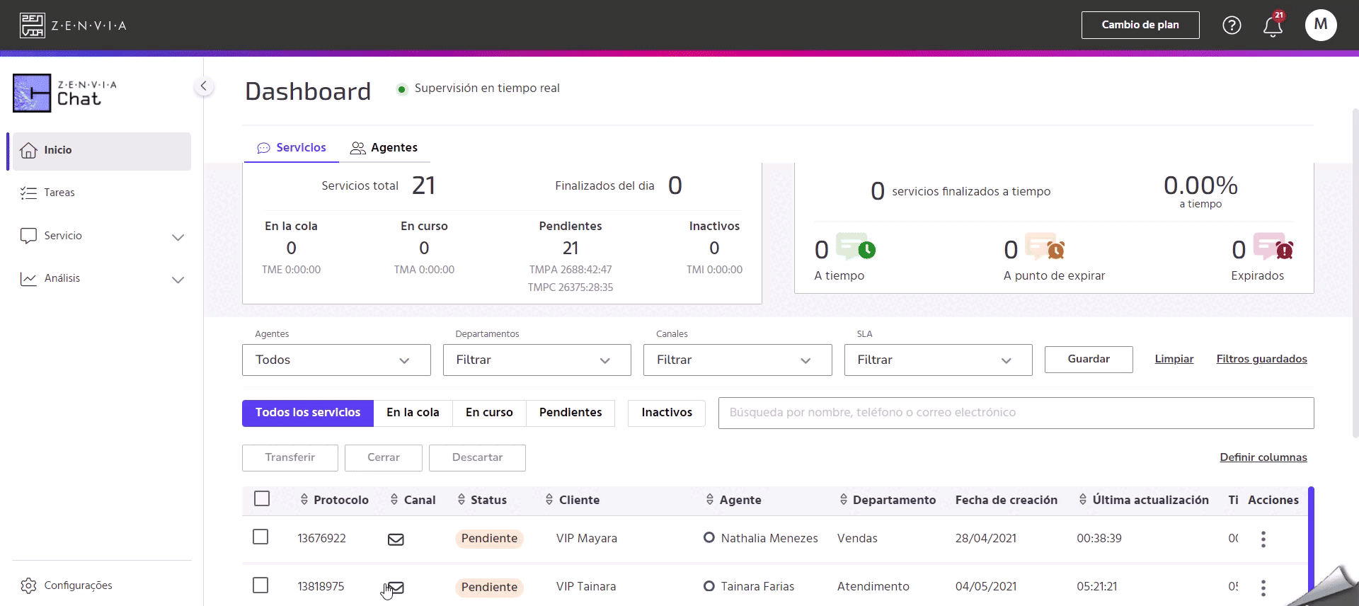 Para incluir un mensaje interno, si tienes el perfil de Administrador en Zenvia Chat, ve a Dashboard, haz clic sobre la atención deseada y luego en el botón Enviar mensaje interno al agente. Al hacer clic en este botón, se mostrará un cuadro de texto en la pantalla donde el Administrador podrá escribir el mensaje al agente.