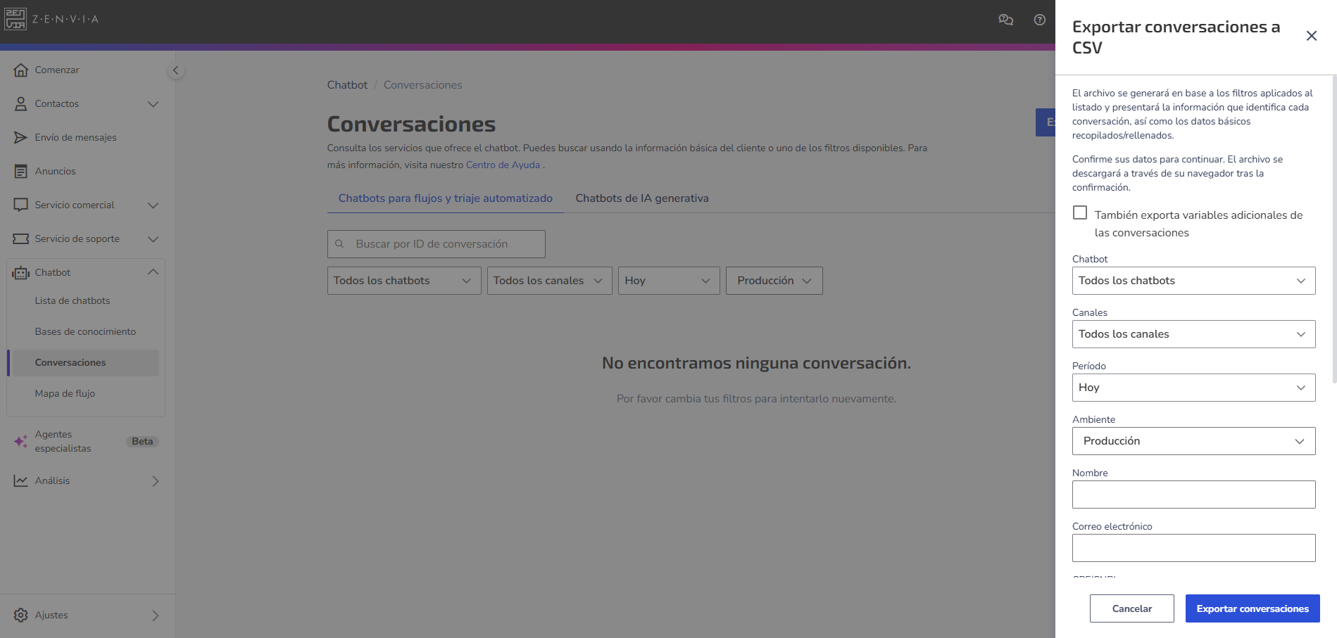 Tip: Marca la opción Exportar también variables adicionales de las conversaciones si quieres incluir variables extras llenadas durante las interacciones.