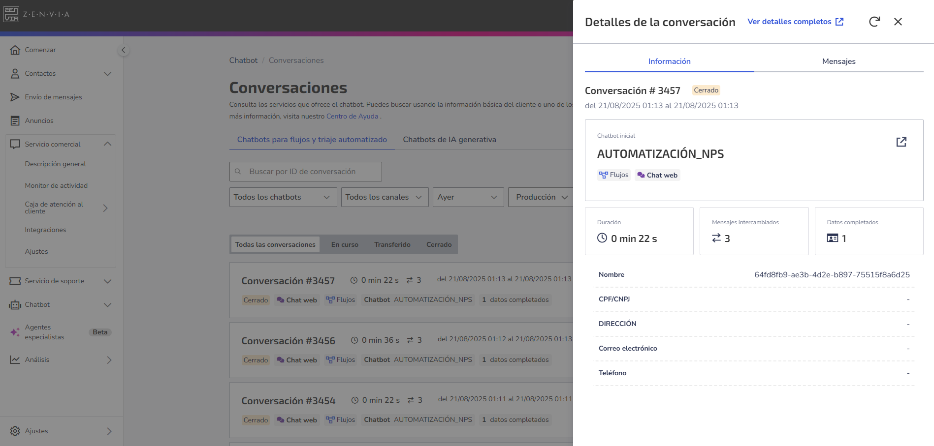 Al hacer clic en Ver detalles en cualquier tarjeta de la lista de conversaciones, se abre una vista lateral con dos pestañas: Información y Mensajes.
