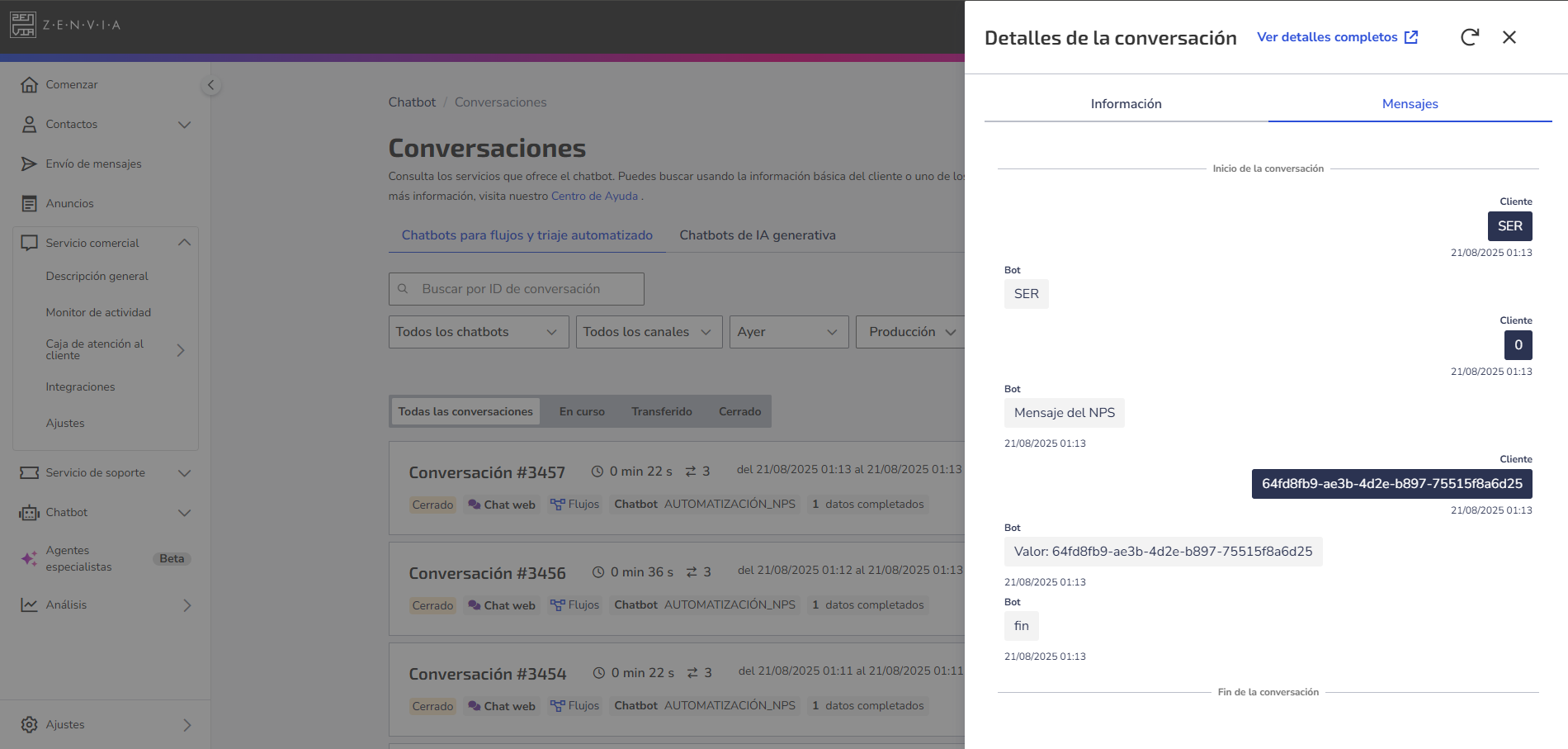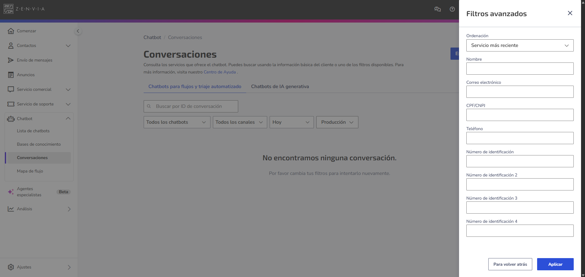 Ya sea para monitorear el rendimiento de un chatbot, revisar interacciones o exportar datos, la pantalla de Conversaciones es un recurso esencial para la gestión y el análisis del servicio automático.