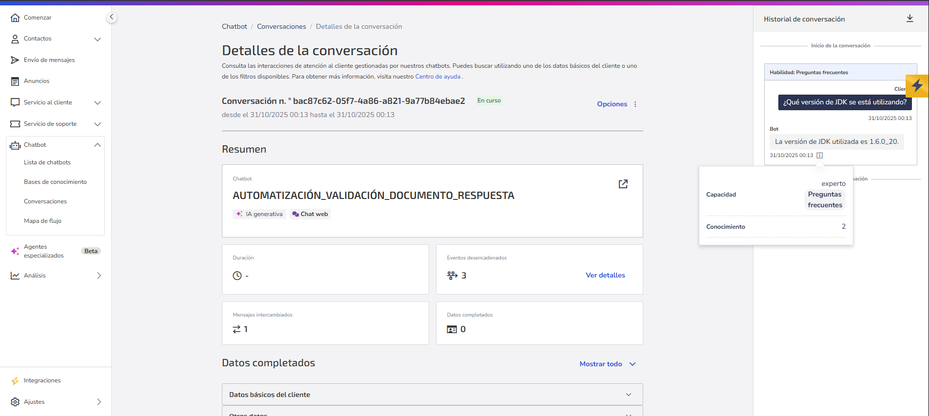 Esta función facilita el análisis de las conversaciones, permitiendo identificar qué mensajes del cliente final activaron habilidades específicas. Esto ayuda a analizar el comportamiento del chatbot y realizar ajustes de forma autónoma.