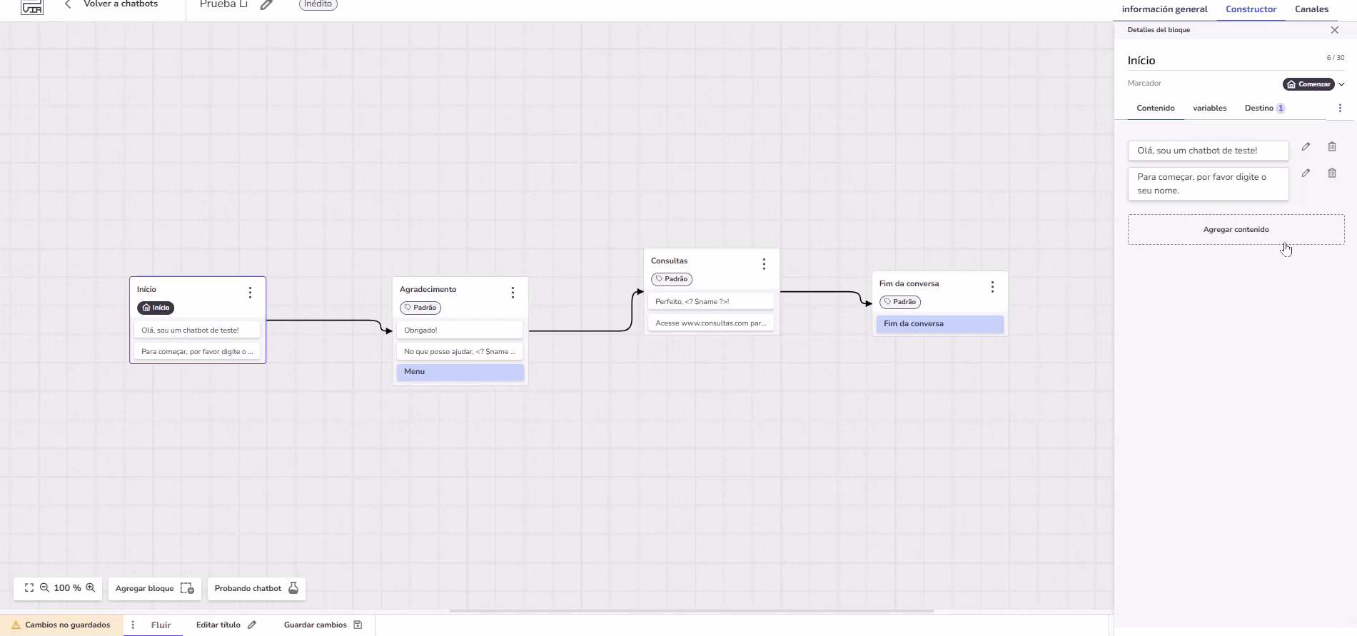 Finalmente, después de configurar todo, haz clic en Guardar cambios y luego en Probar Chatbot para ver cómo funciona el flujo en la práctica.