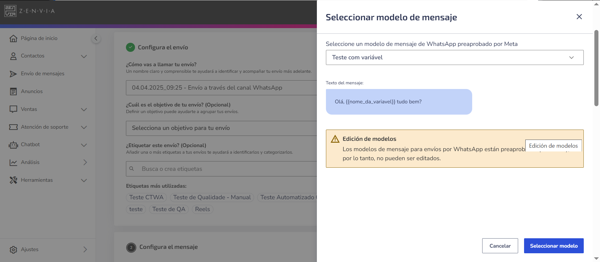 1. El canal de WhatsApp está configurado en Zenvia Customer Cloud en Ajustes > Canales.