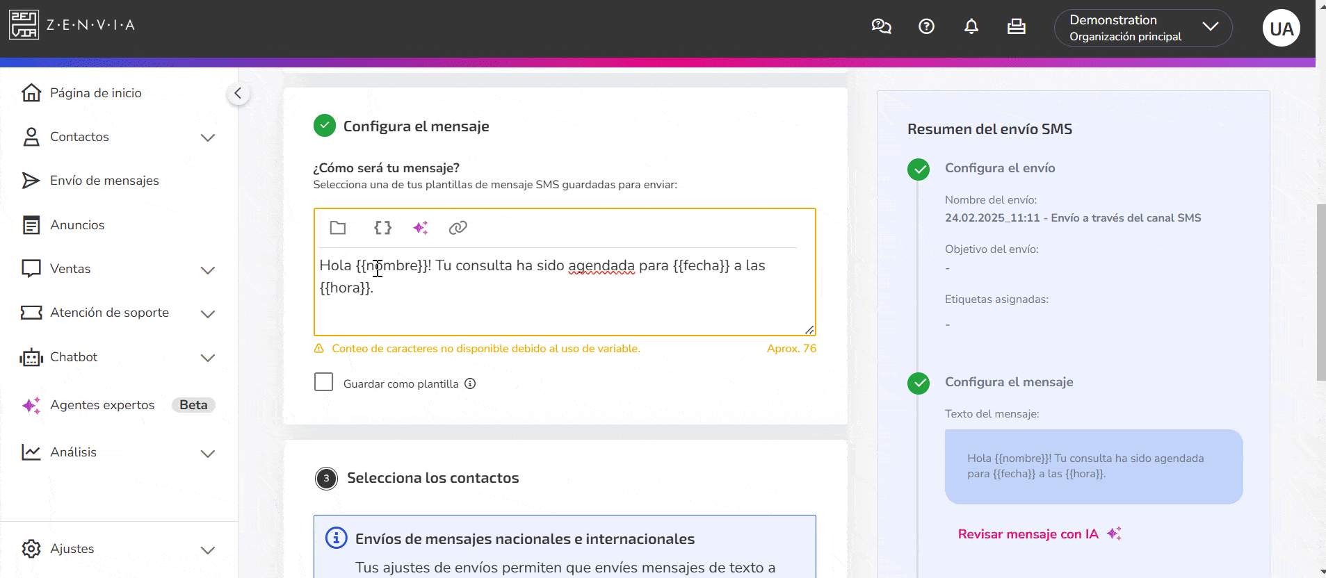 - Elige una lista de contactos, contactos específicos o reglas de segmentación ya añadidas en Zenvia Customer Cloud;