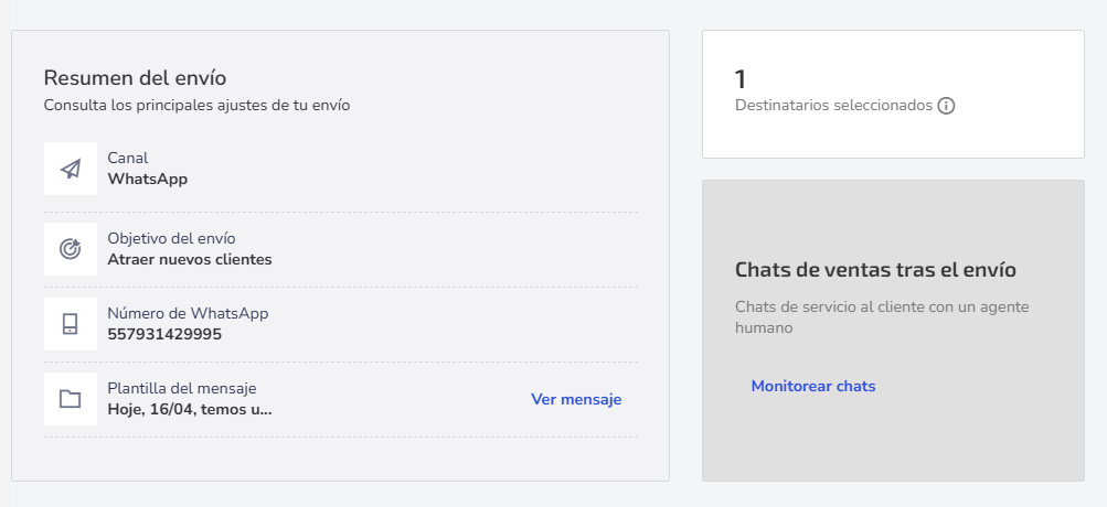 El resumen del envío muestra las configuraciones, incluyendo canal, objetivo y mensaje enviado, variando según el canal elegido. Por ejemplo, en WhatsApp, muestra el número y la plantilla utilizada; en el correo electrónico, el asunto del mensaje; y en SMS, el contenido y posibles cortes del mensaje.