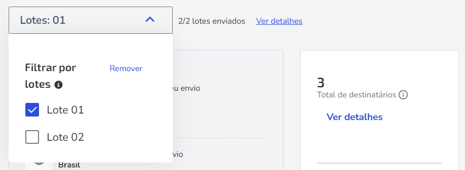 Si el envío fue dividido en lotes, puedes utilizar el filtro de lotes enviados para ver por separado la información de cada lote. Al seleccionar un lote específico, haz clic en la opción Ver detalles para ver la fecha y hora en que fue configurado, la cantidad de destinatarios incluidos y el estado actual del envío, que puede ser Programado (planificado para envío), Enviando (en proceso), Enviado (ya enviado) o Cancelado.