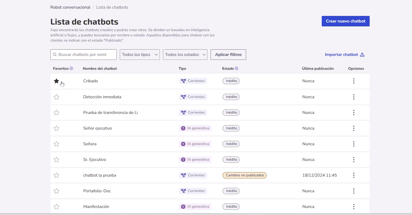 Esta lista permite filtrar los chatbots por tipo, ya sea por Inteligencia Artificial, Evaluación Previa o Flujos, y también buscarlos por nombre o estado.