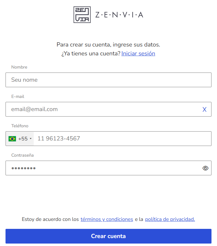 Después, serás redirigido a app.zenvia.com/ y podrás seguir los pasos de creación de la cuenta.