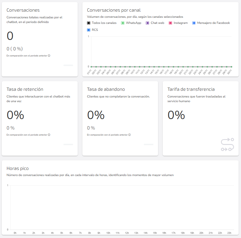 Los análisis de Chatbots permiten monitorear métricas e índices clave para evaluar el rendimiento de tu bot, como el compromiso y la satisfacción de los clientes. Puedes seleccionar el tipo de chatbot, configurar filtros y visualizar los resultados en el panel.