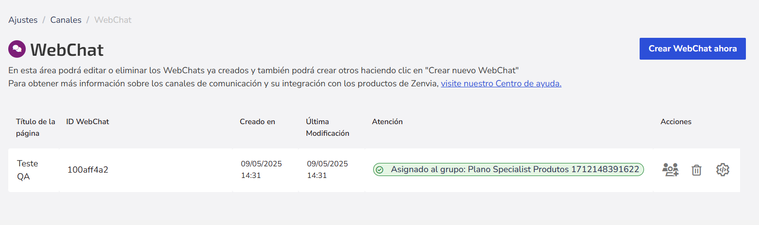 Todos los WebChats creados quedarán guardados en la pantalla principal del canal, en una lista con: