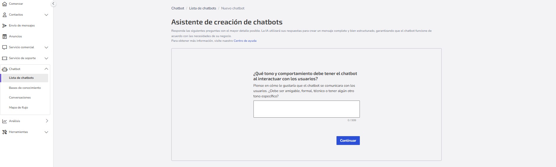 El Asistente de creación de chatbot es una herramienta que simplifica la creación de chatbots, haciendo el proceso más rápido e intuitivo.