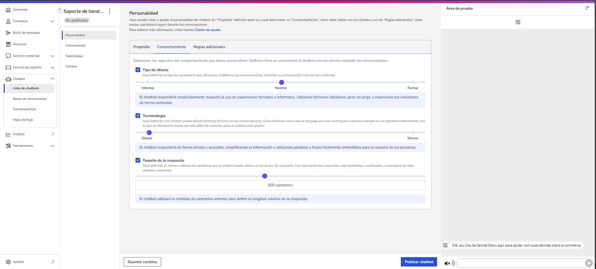 • Comportamiento: Establezca cómo debe interactuar el chatbot con los usuarios, incluyendo Tipo de lenguaje, Terminología y Tamaño de la respuesta.