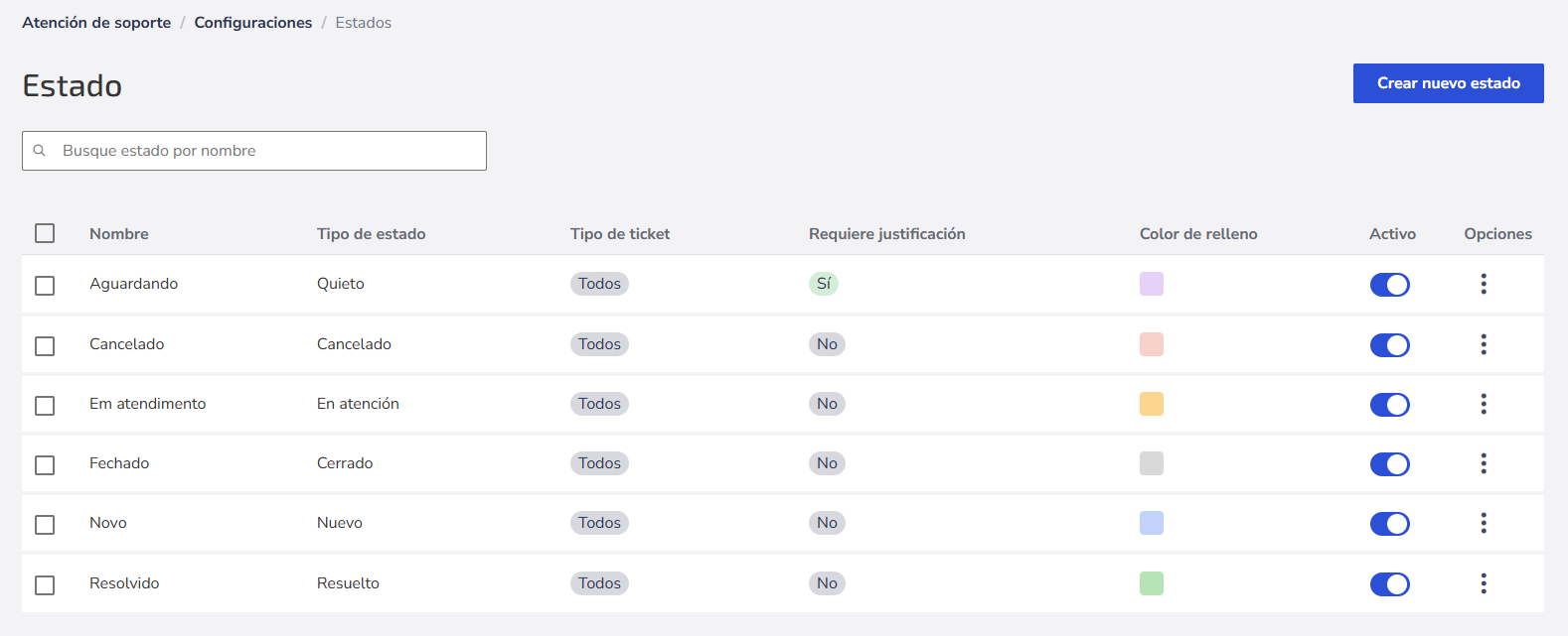 Puede crear nuevos Estatus personalizados para facilitar la organización o utilizar las opciones predeterminadas: Pendiente, Cancelado, En Proceso, Cerrado, Nuevo y Resuelto.