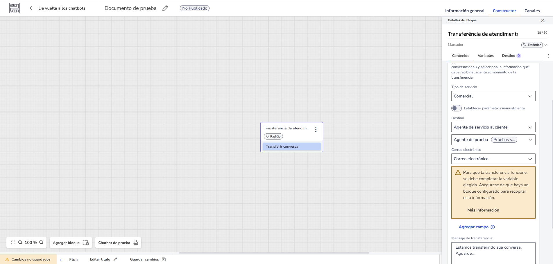 Bloque 1: El bloque de la transferencia: Es aquí donde le indicarás al sistema que la conversación necesita ir a un agente humano.