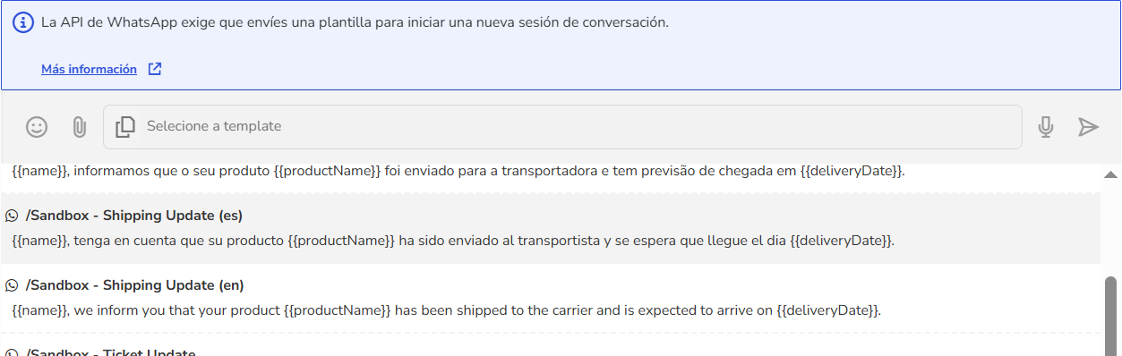 💡 Tip: Si el contacto tiene una sesión abierta o está en un chatbot, no será posible enviar plantillas de mensaje hasta que la sesión actual finalice o expire.