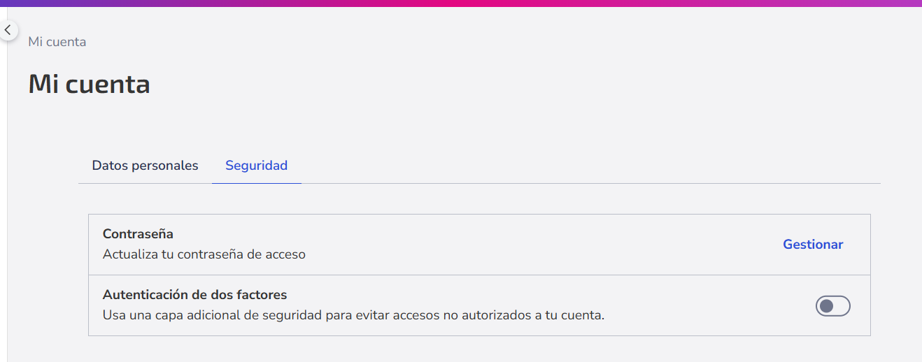 - Si ya tiene un método de autenticación, el botón Autenticación de dos factores aparecerá desactivado.