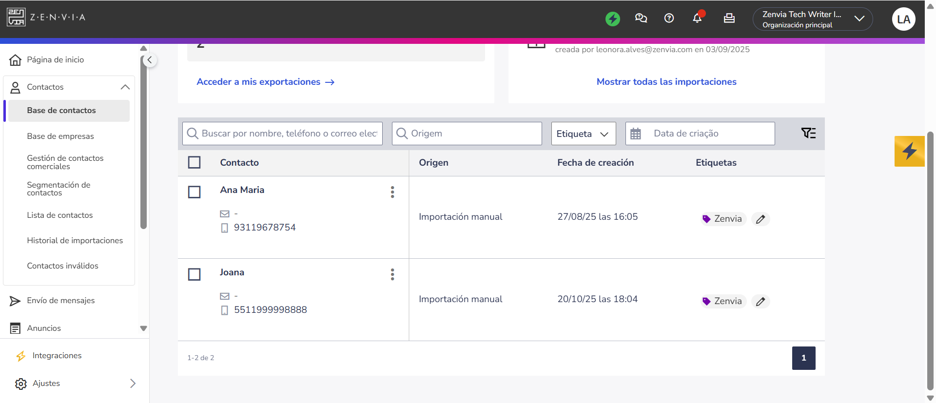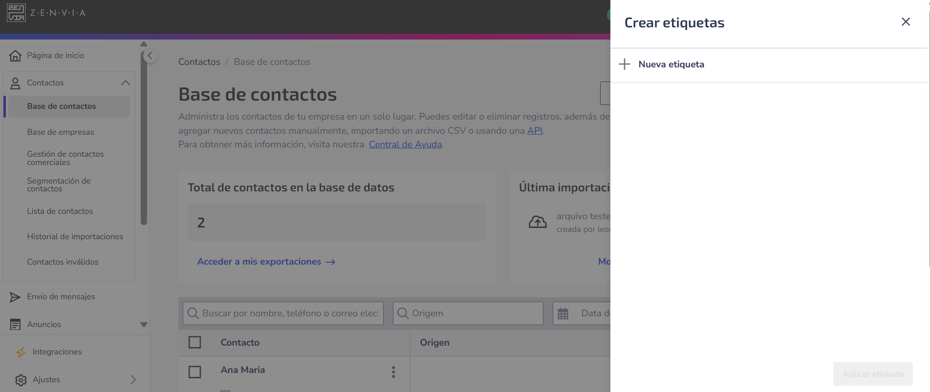 Base de contactos: Lugar donde las etiquetas se crean y se aplican directamente a los contactos. También permite filtrar y segmentar la base con base en las etiquetas atribuidas - por ejemplo, para generar listas específicas o identificar grupos de clientes.