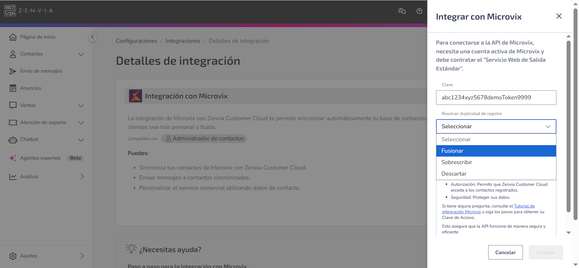 Debes obtener la clave de acceso del WebService de salida estándar en Microvix y configurarla en Zenvia Customer Cloud.