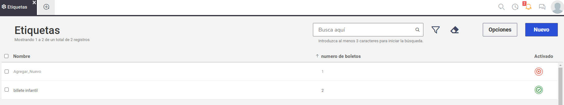 Para acceder a esta funcionalidad, vaya a Atención de soporte > Configuraciones > Etiquetas. En la pantalla principal, verá todos sus registros existentes.