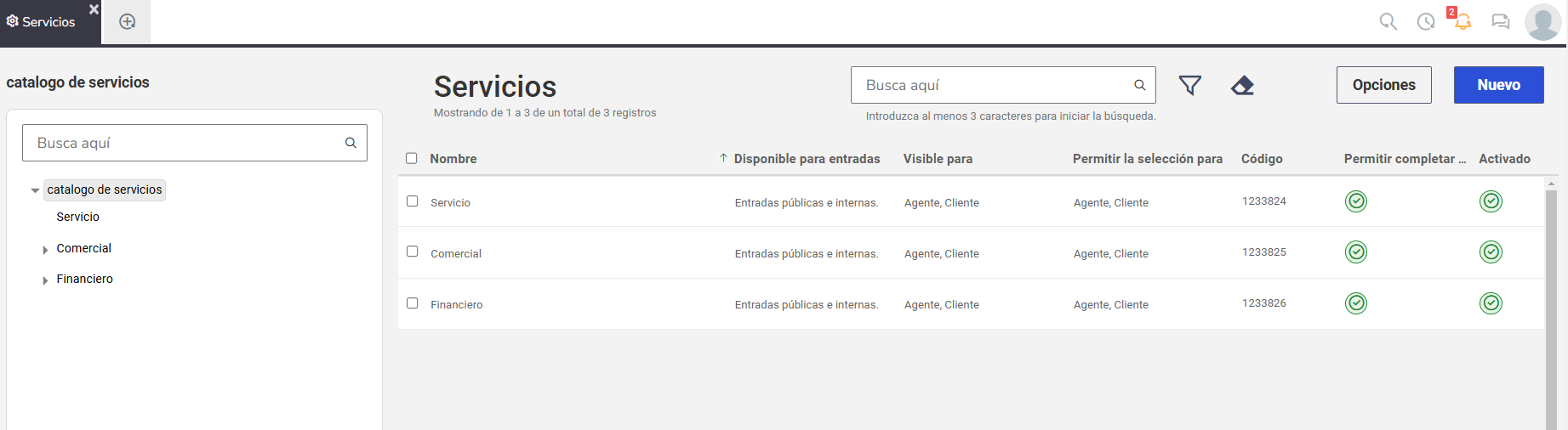 Para acceder a esta funcionalidad, vaya a Atención de soporte > Configuraciones > Servicios. En la pantalla principal, verá el catálogo de servicios y los detalles registrados en el sistema.