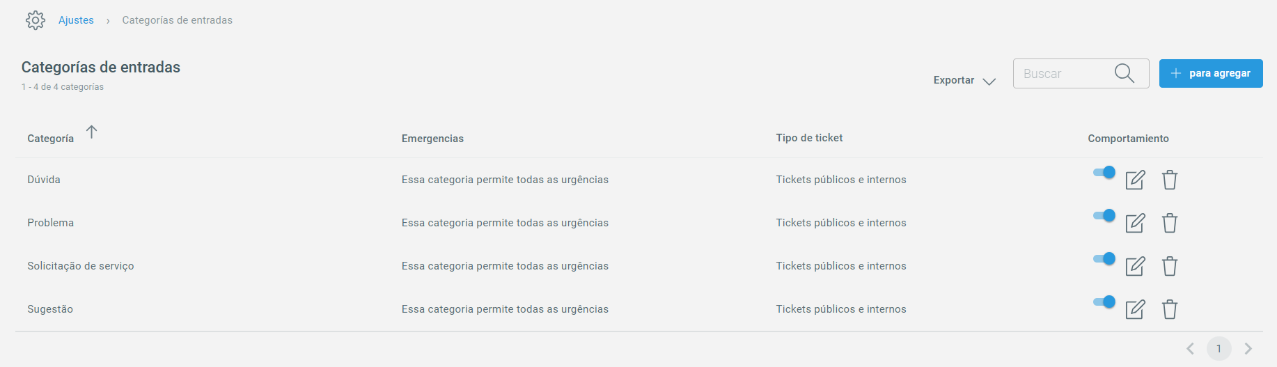 Para acceder a esta funcionalidad, vaya a Atención de soporte > Configuración > Categorías. En la pantalla principal, verá las opciones predeterminadas: Dudas, Problema, Solicitud de servicio y Sugerencia.