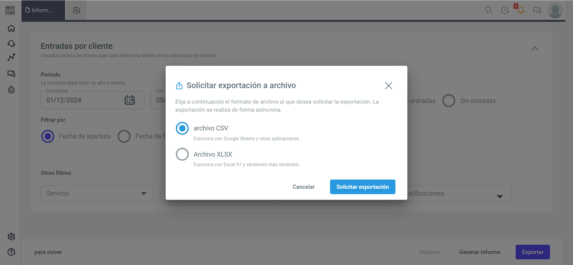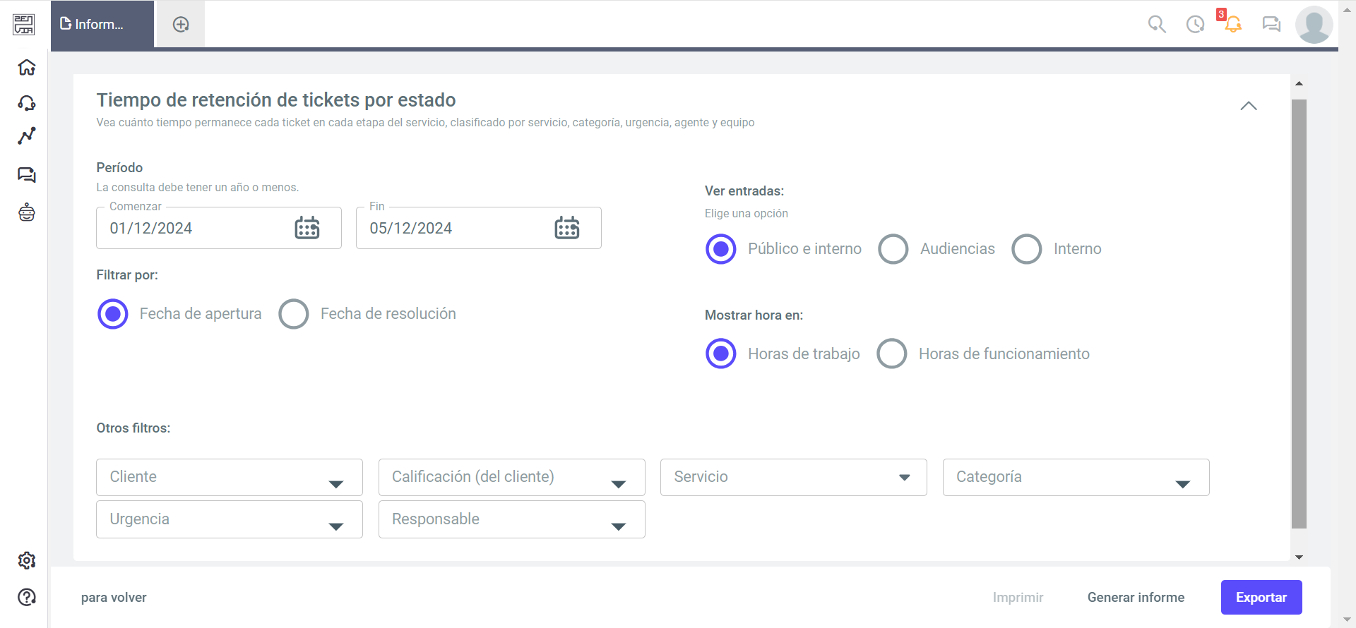 - Apertura o cierre de tickets: Filtra por fecha de apertura o fecha de cierre si deseas indicar en el informe el total de tickets abiertos o cerrados.