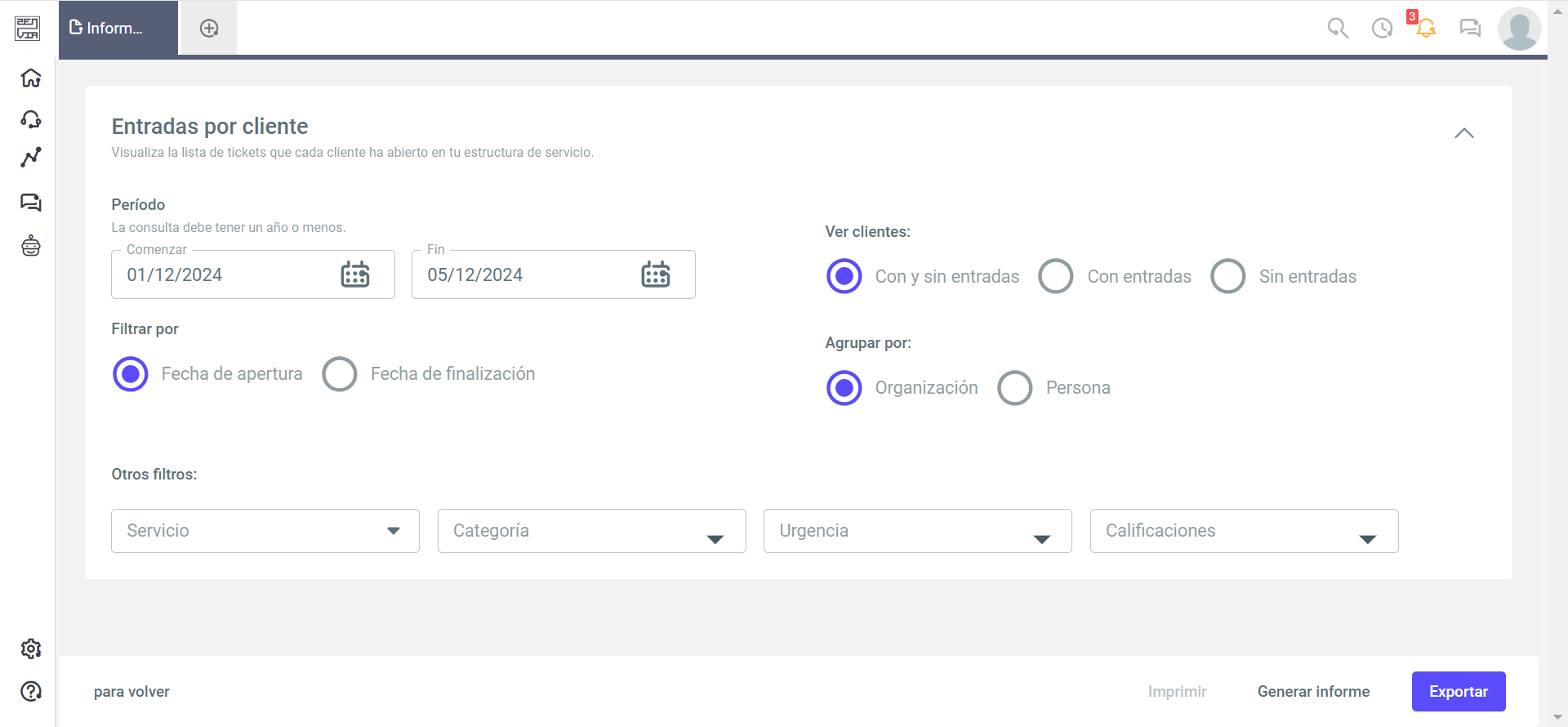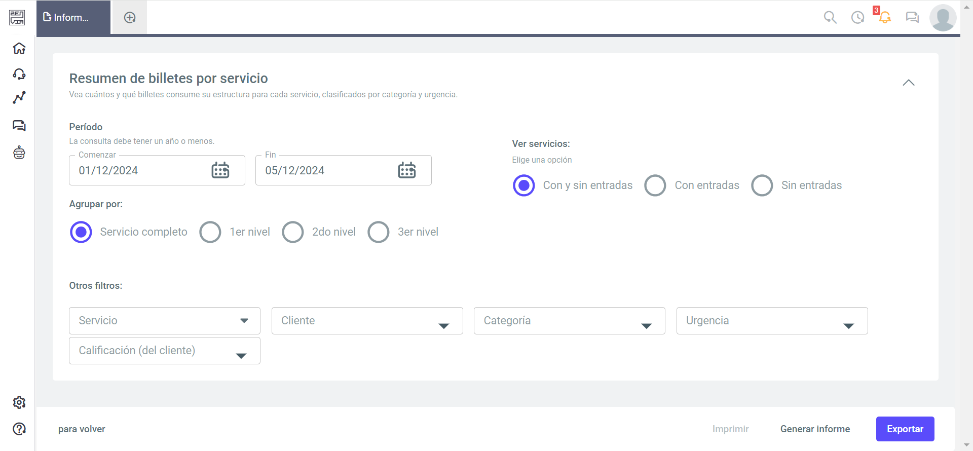 - Otros filtros: Puede filtrar por cliente, clasificación del cliente, servicio, categoría, urgencia y responsable.