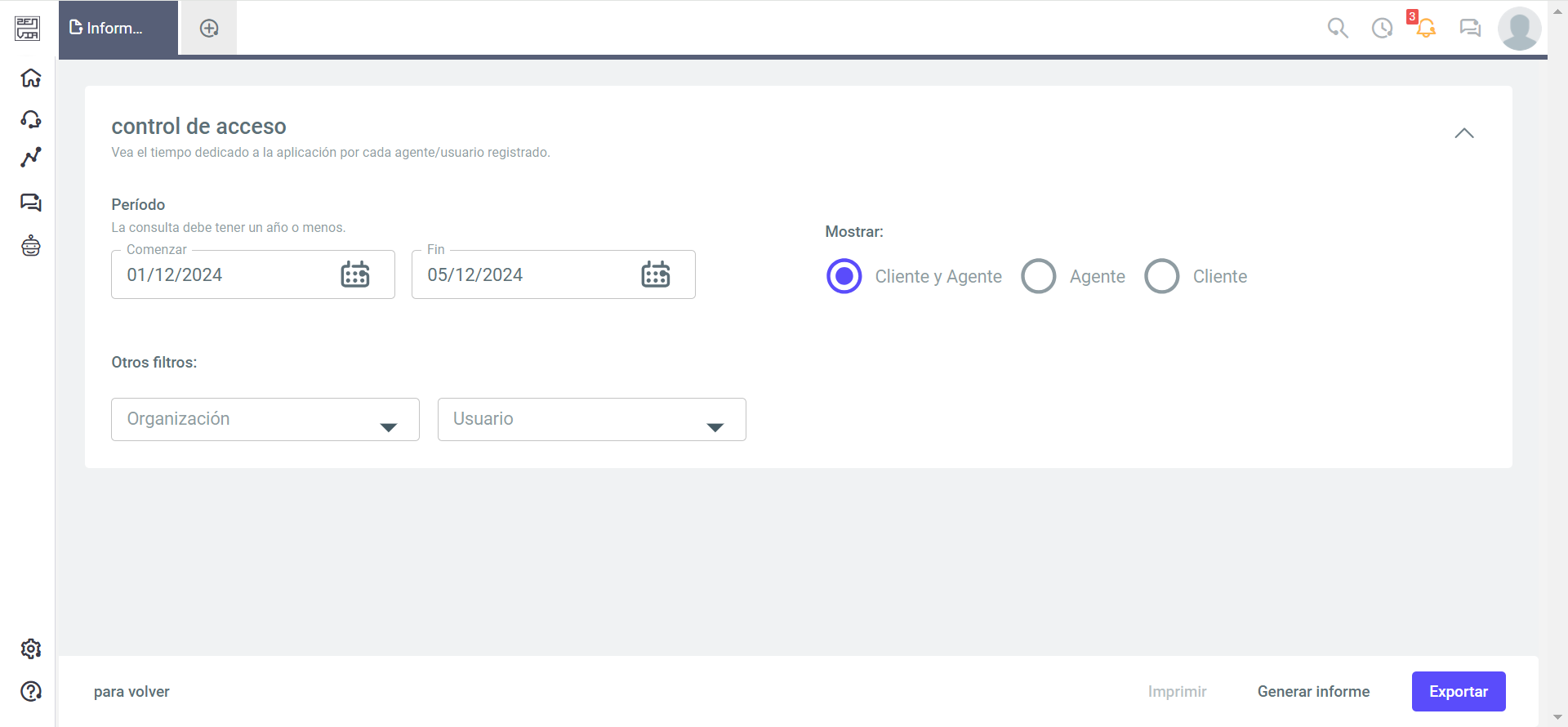 - Tipo de acceso: Seleccione si desea visualizar el tiempo empleado por agente, cliente o ambos.