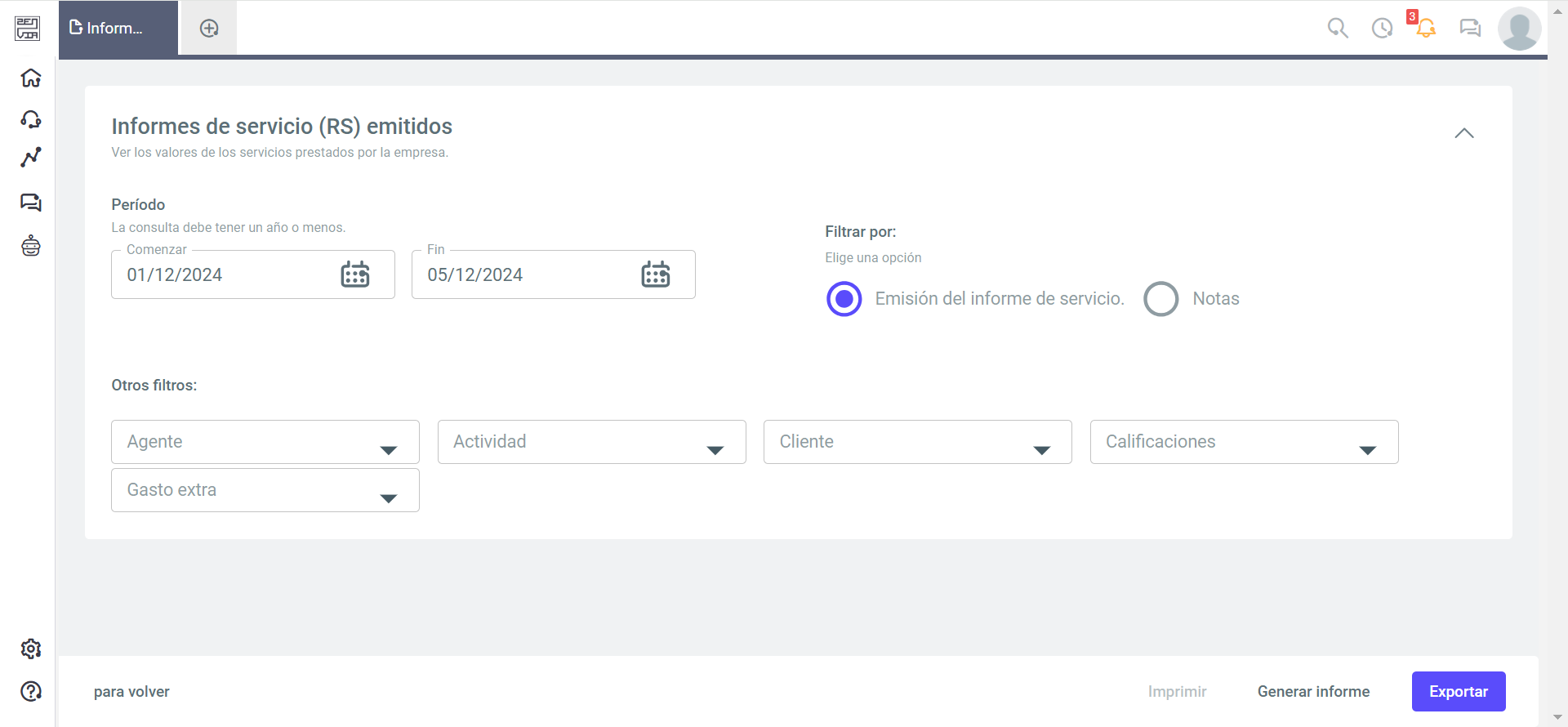 - Otros filtros: Puede filtrar por agente, cliente, clasificación y gastos extras.