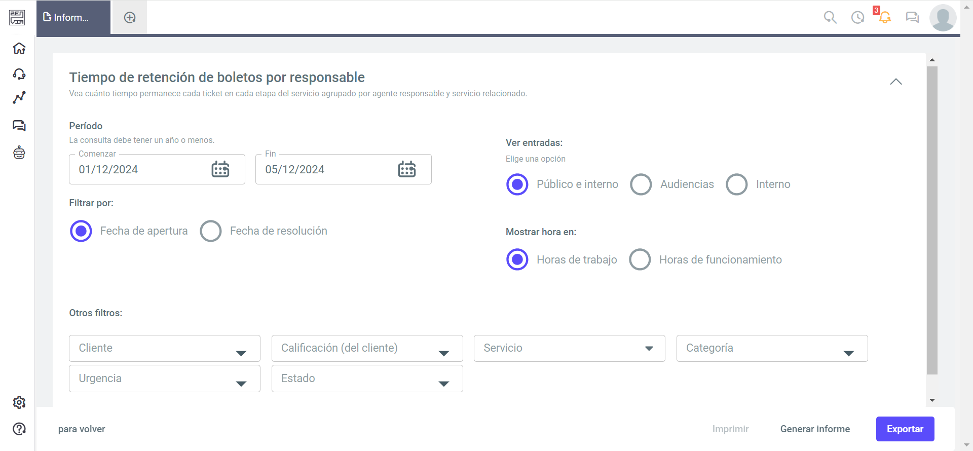 - Otros filtros: Puede filtrar por cliente, clasificación del cliente, servicio, categoría, urgencia y responsable.