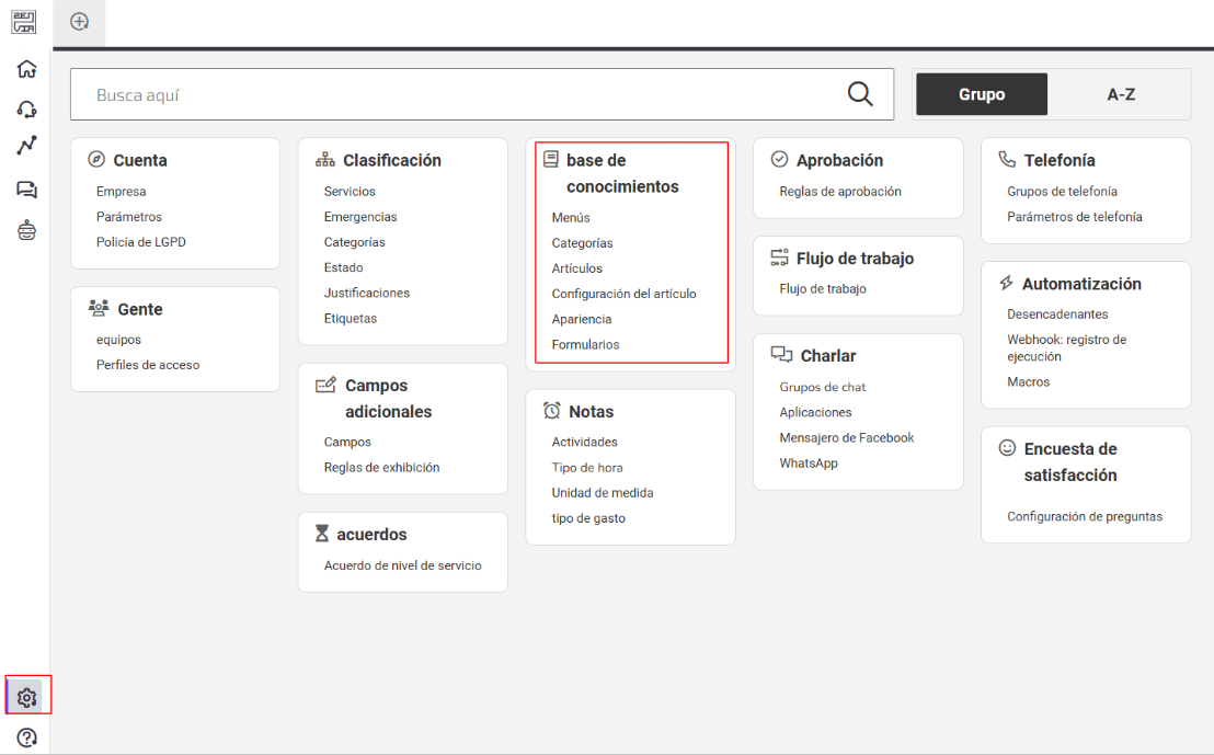 Para acceder a esta funcionalidad, vaya a Atención de soporte > Configuración > Artículos.