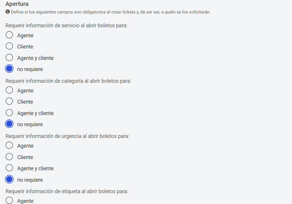 En los parámetros de Tickets, puedes seleccionar qué campos serán obligatorios al crear tickets y para quiénes serán requeridos.