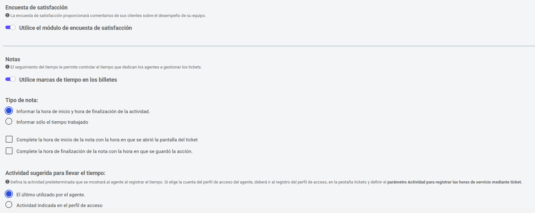- Actividad sugerida para el registro de horas: utiliza la última actividad del agente, la indicada por el perfil de acceso o ninguna.