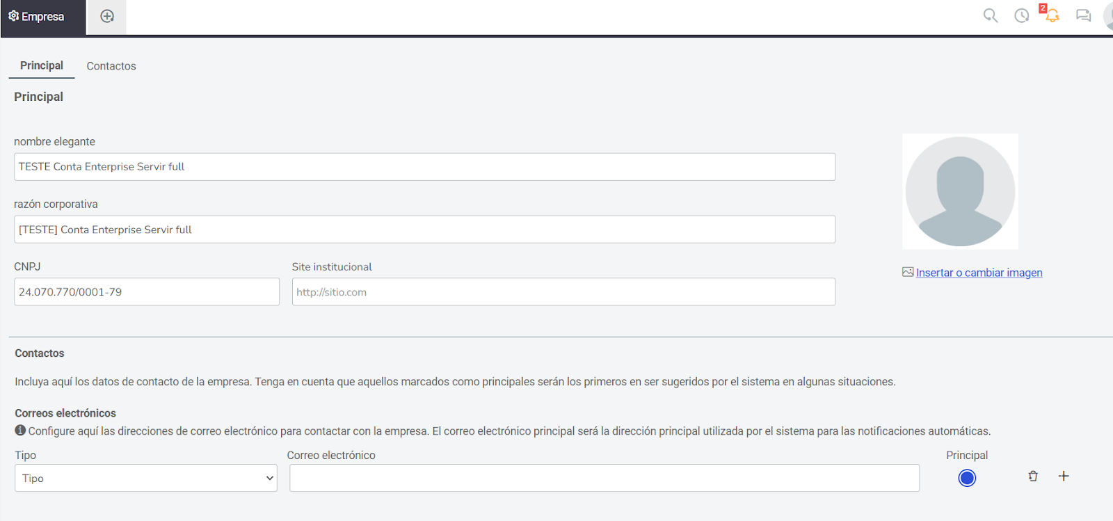 En Contactos, agrega los contactos de la empresa seleccionando el tipo (Personal o Profesional) y el correo electrónico. El correo principal será utilizado por el sistema para notificaciones automáticas.