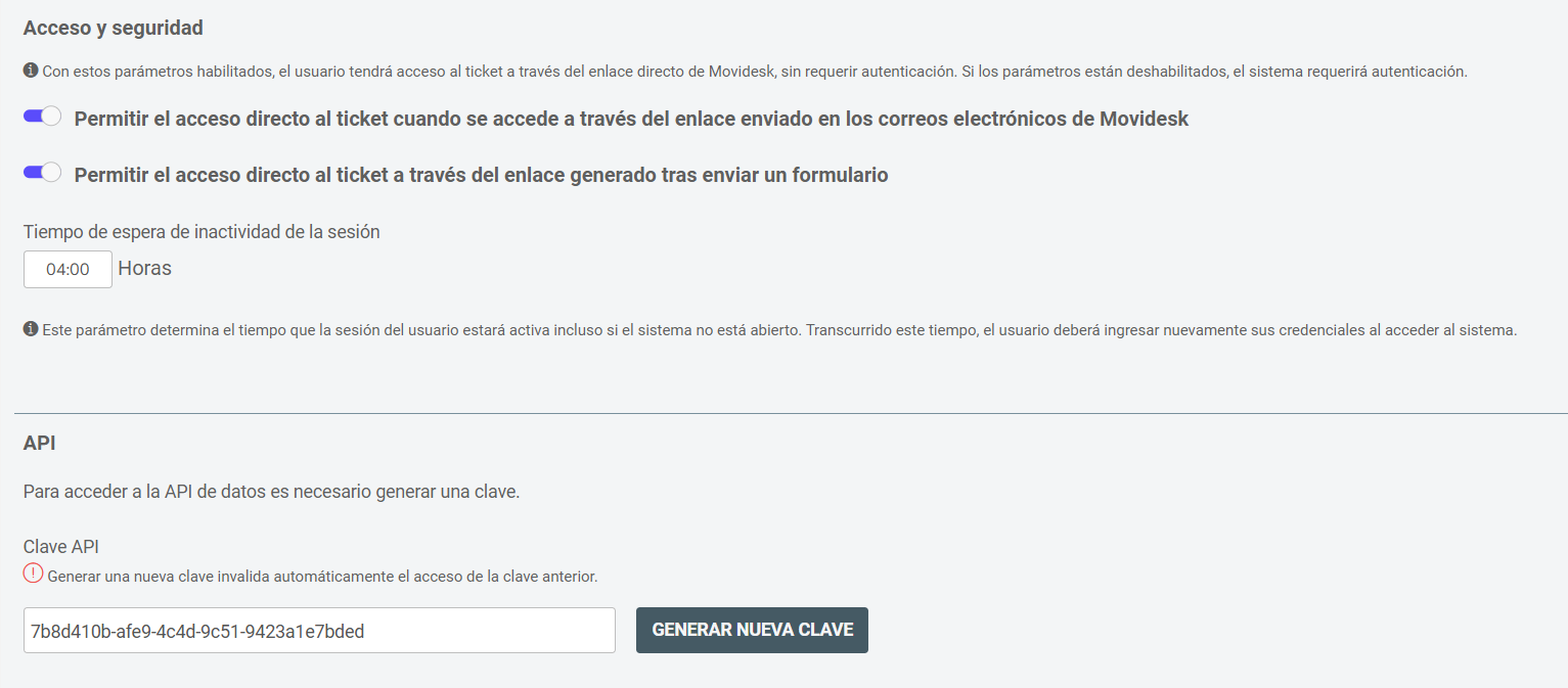 En API, puedes generar una clave de acceso a la API para realizar integraciones y configuraciones avanzadas.