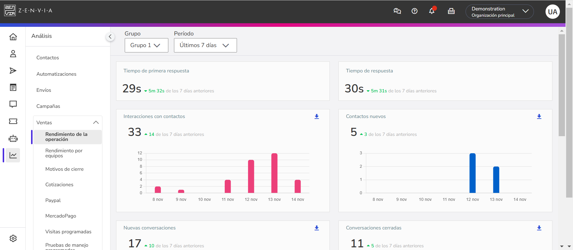 Centraliza informes de automatización, envíos, rendimiento de campañas y atenciones comerciales y de soporte. Ahora es posible visualizar informes por grupos, consumo y contratos.