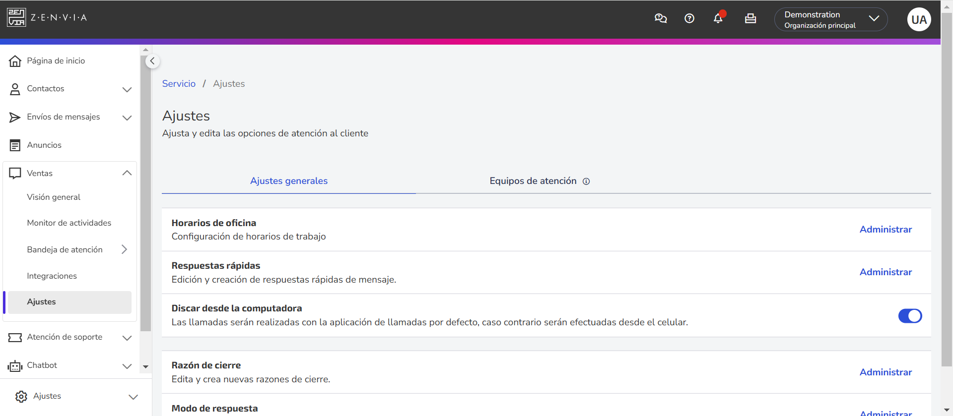 • Ajustes generales: Configure el horario de atención, cree respuestas rápidas (general), habilite llamadas desde la computadora, defina motivos de cierre y ajuste el modo de respuesta.