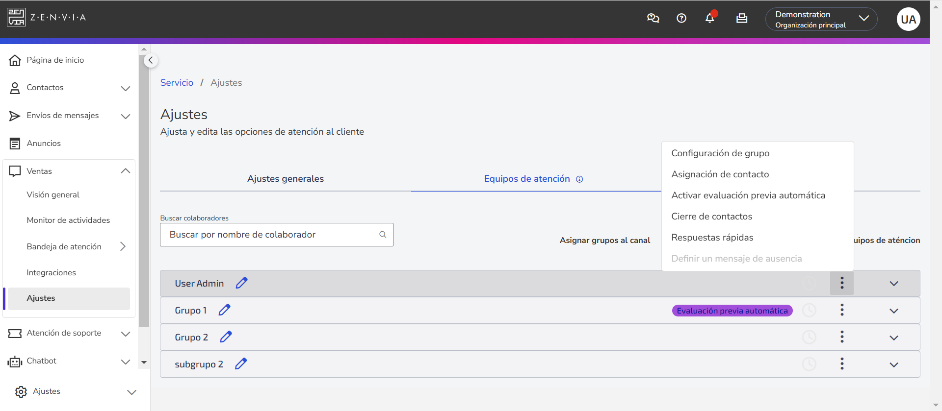 Ajustes | Permite configurar los canales y realizar la asignación de grupos de atención. Aprende cómo: Además, puedes crear modelos de mensaje, gestionar tokens y webhooks, realizar pruebas en Sandbox y gestionar usuarios y organizaciones. Una parte importante de este módulo es la adición de usuarios y la definición de sus perfiles de acceso, lo que permite determinar qué funcionalidades del software puede acceder cada uno. Para la atención comercial, se utiliza el perfil de agente, que básicamente tiene acceso solo a la bandeja de atención. Para más información, consulta el artículo Perfiles de acceso de usuarios. |
