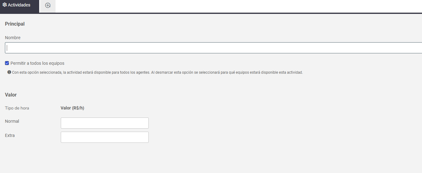 El registro de Actividades permite definir tipos de horas para cada actividad y configurar un valor predeterminado para cada tipo.