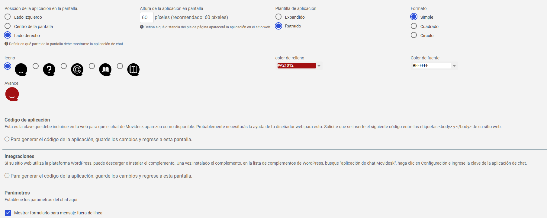 6 . En Definición de apariencia , personalice el título, mensaje de bienvenida, logotipo, colores, icono, posición y altura del chat;7. En Código de la aplicación , obtenga la clave para incluir el chat en el sitio web.